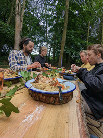 You'll be able to wonder and enjoy the site, or join the workshop before dinner sharing in ancient practices in breathwork and movement to help us connect to the body and our senses. These sessions are led by Jacob, while Matthew (The Food Alchemist) prepares a feast to nourish and inspire you. Cooked over open flame and all prepared from scratch on site, the organic local ingredients are alchemised onto your table from the forest kitchen. Themes from the forest appear on the plate, as foraged and collected edibles are infused and used to create your dishes. All diets catered too, but be sure to specify in your booking.